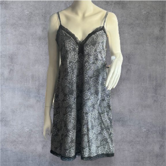 Egyenes szabású, V nyakkivágású, dekoltázsnál és alján csipke szegéllyel, pántja állítható.