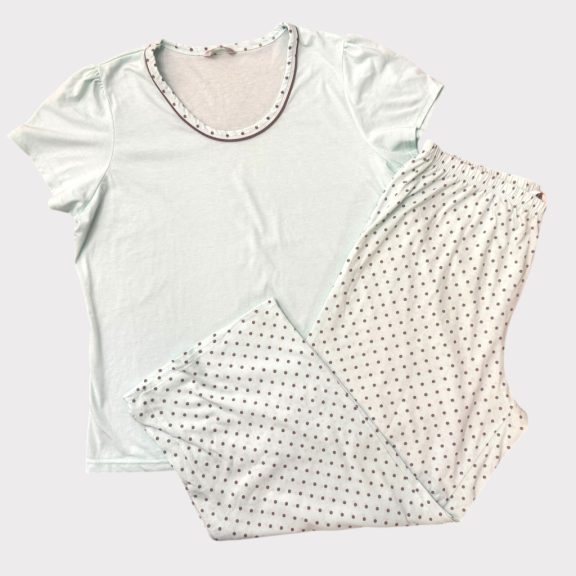 A felső egyenes szabású, kerek nyakú, a nadrág dereka gumis.