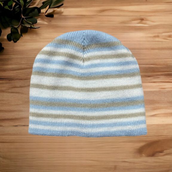V.kék-bézs csíkos sapka, puha kötött anyag, sztreccses.